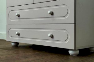 Корпус шкафа выполнен из ЛДСП толщиной 16 мм, фасады изготовлены из МДФ в плёнке ПВХ и декорированы фрезеровкой, подчёркивающей стиль серии Милана. Оригинальные круглые ручки и опоры придают шкафу аккуратный и современный вид, делая его гармоничной частью детского интерьера.